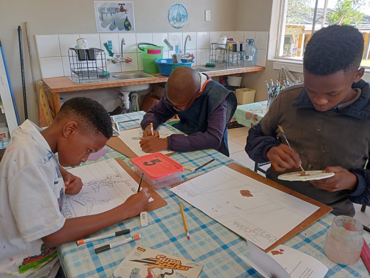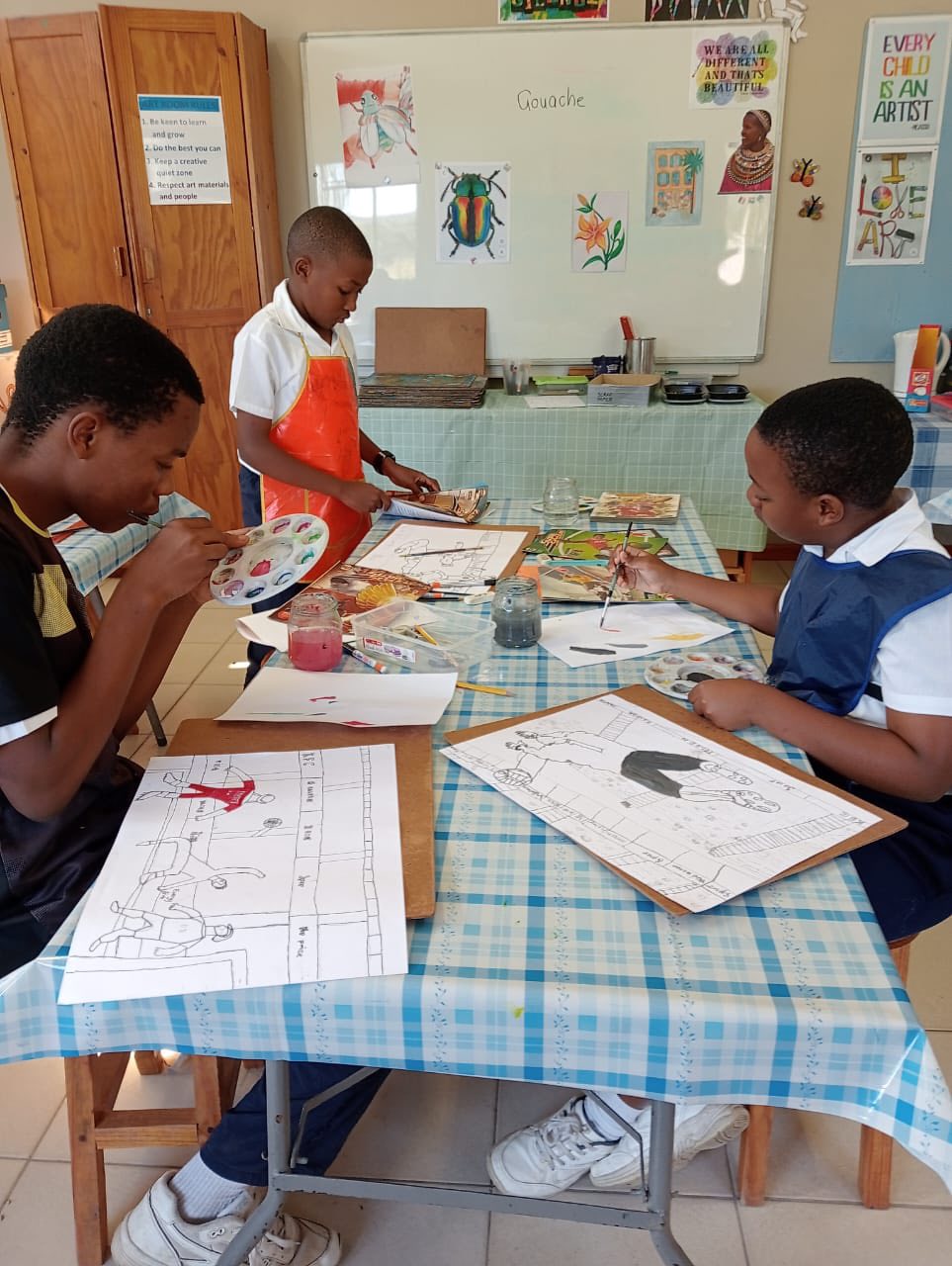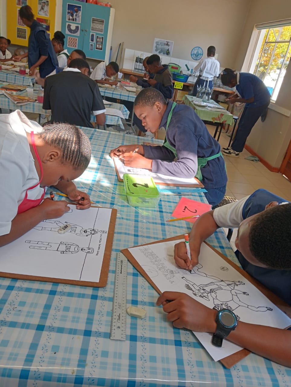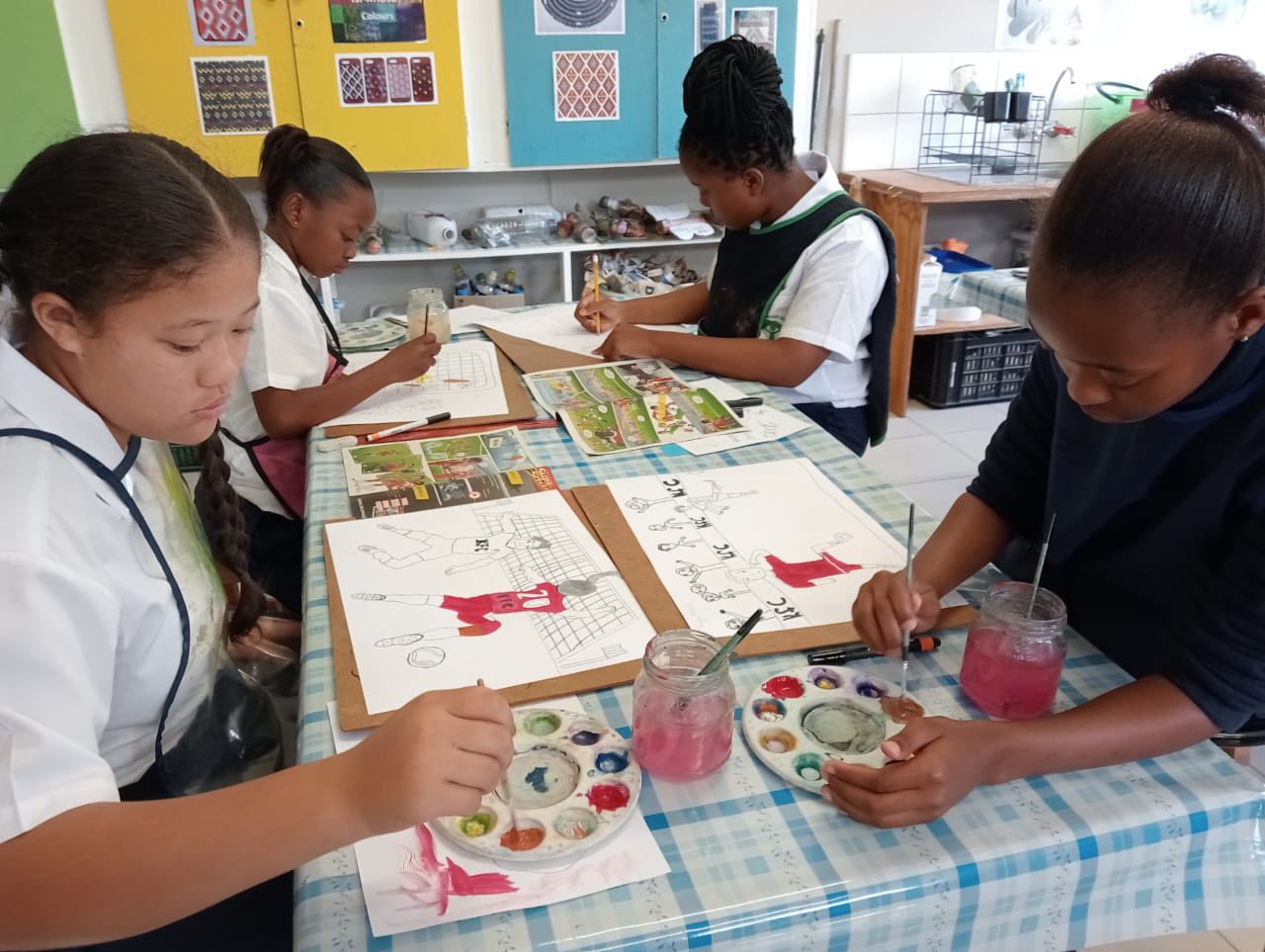 The Grade 6 and 7 class enjoy Art class with Mrs Aliber, drawing and painting their action shots.